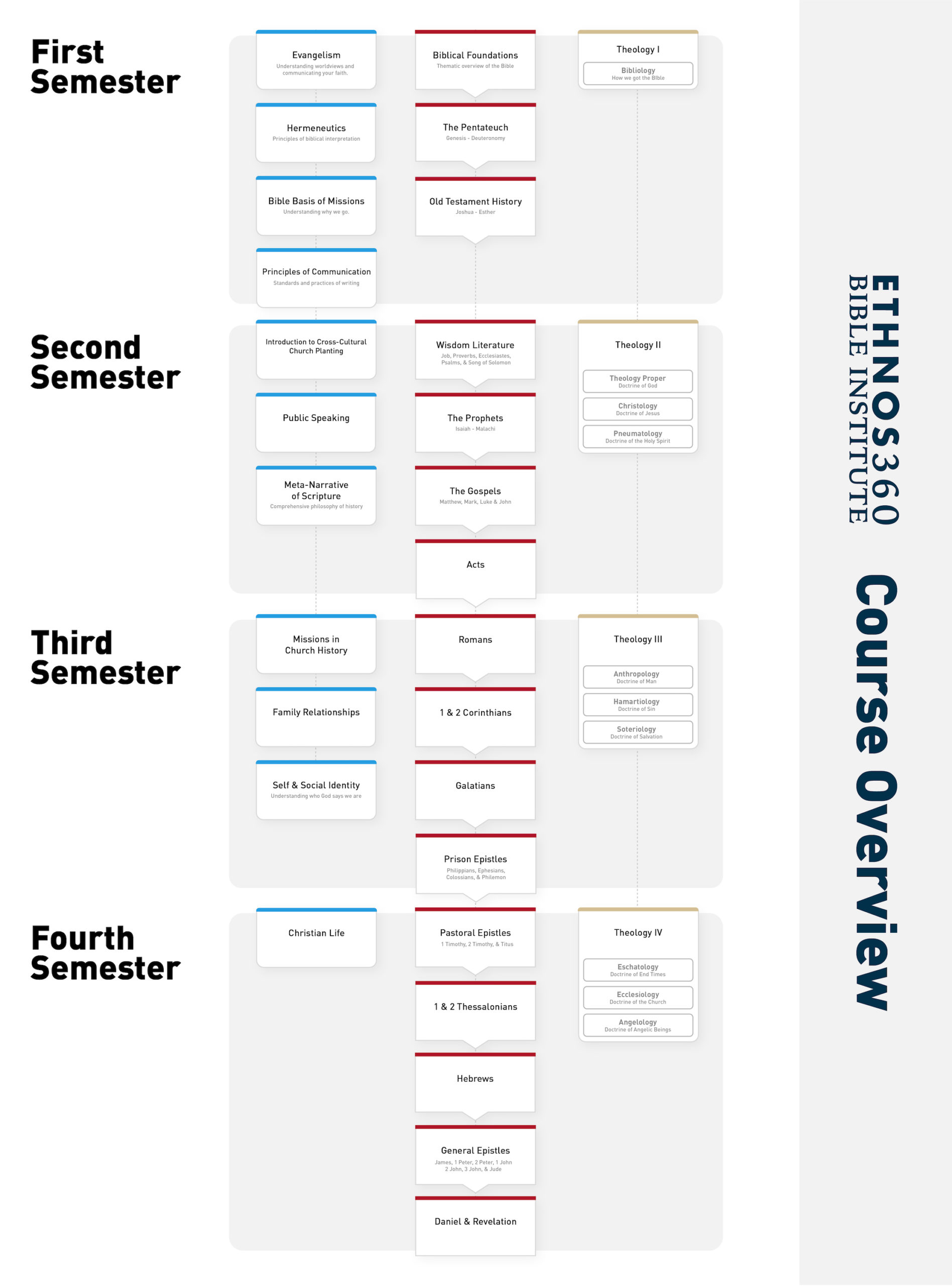 A broad snapshot into your biblical studies. This program has three primary types of classes you will take throughout your time as a student.